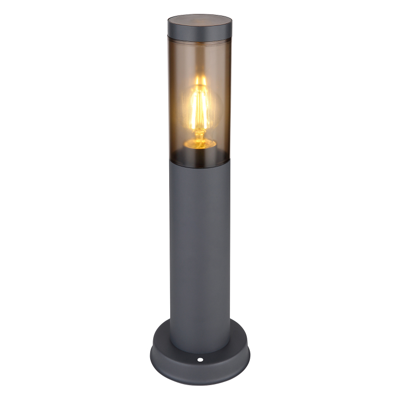 materiál: kov- nehrdzavejúca oceľ/plast farba svietidla: antracit/dymová svetelný zdroj: 1xE27/23W/230V - žiarovka nie je súčasťou svietidla rozmery svietidla: výška - 45cm, priemer - 12,7cm (základňa o priemere 7,6cm) stupeň krytia: IP44 - ochrana svietidla proti telesám > 1mm, ochrana pred stekajúcou vodou