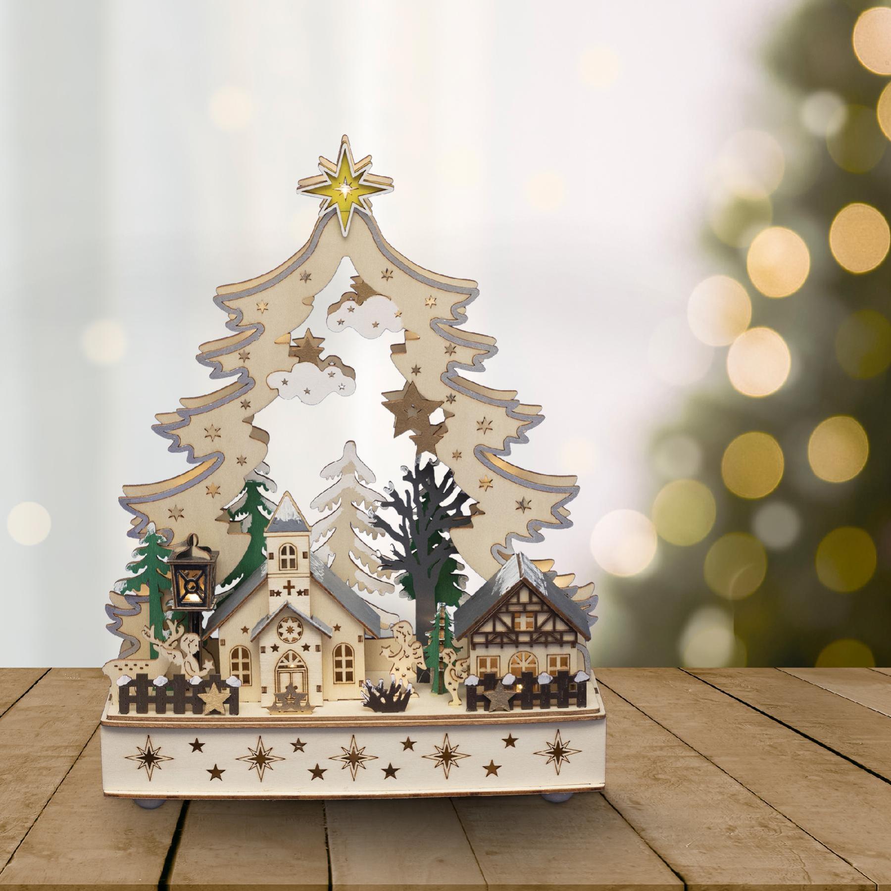 - Drevený vyrezávaný svietnik vianočná dedinka 12LED teplá biela, výška: 33cm, na batérie