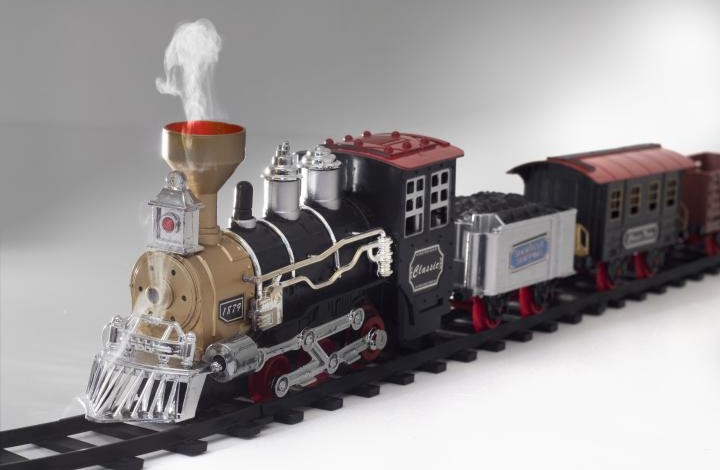 - Elektrický vláčik s koľajnicami dymí a vydáva zvuk, na batérie