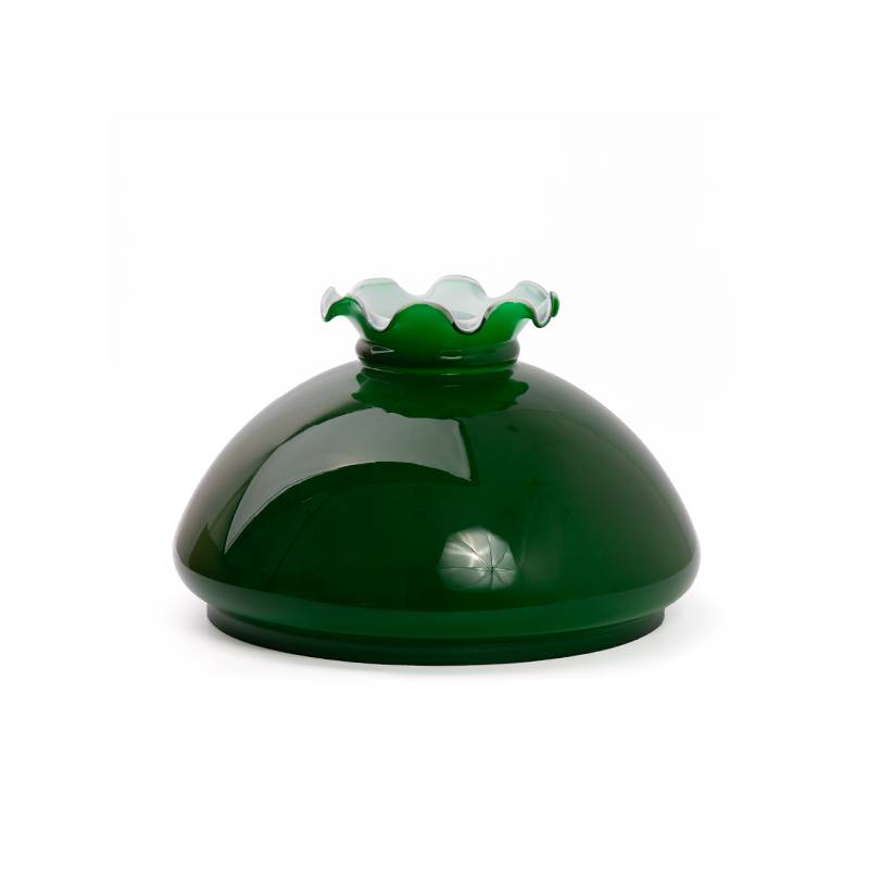 Sklenené lesklé zelené tienidlo ručne vyrobené z vysoko kvalitného opálového (mliečneho) skla s priemerom 23,4cm. Určené pre petrolejovú/olejovú lampu alebo jej modernú elektrickú verziu. Úplne nové priamo od výrobcu.