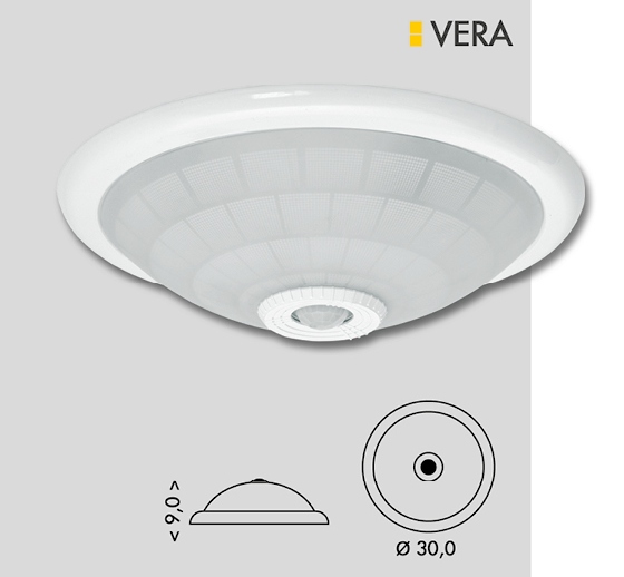Praktické nástenné a stropné svietidlo VERA je vyrobené z kovu a skla a disponuje senzorom pohybu + stmievania. Využíva štandardné päticu E27 (max. 80W) a možno osadiť aj úspornou žiarivkou. Uhol pokrytia je celých 360? a dosah senzora je až 6 metrov pri montážnej výške 2,5m. Pomocou otočných ovládačov je možné nastaviť citlivosť senzorov a čas zapnutia.